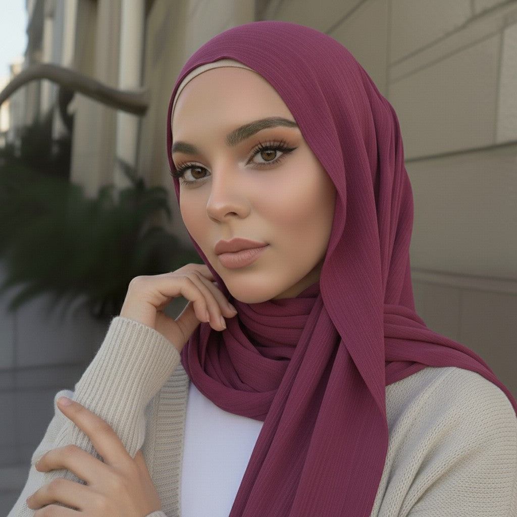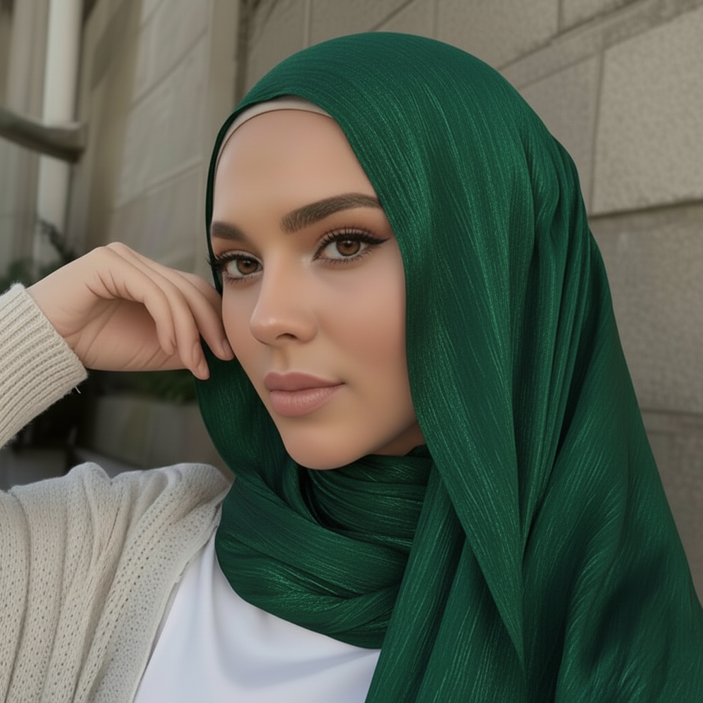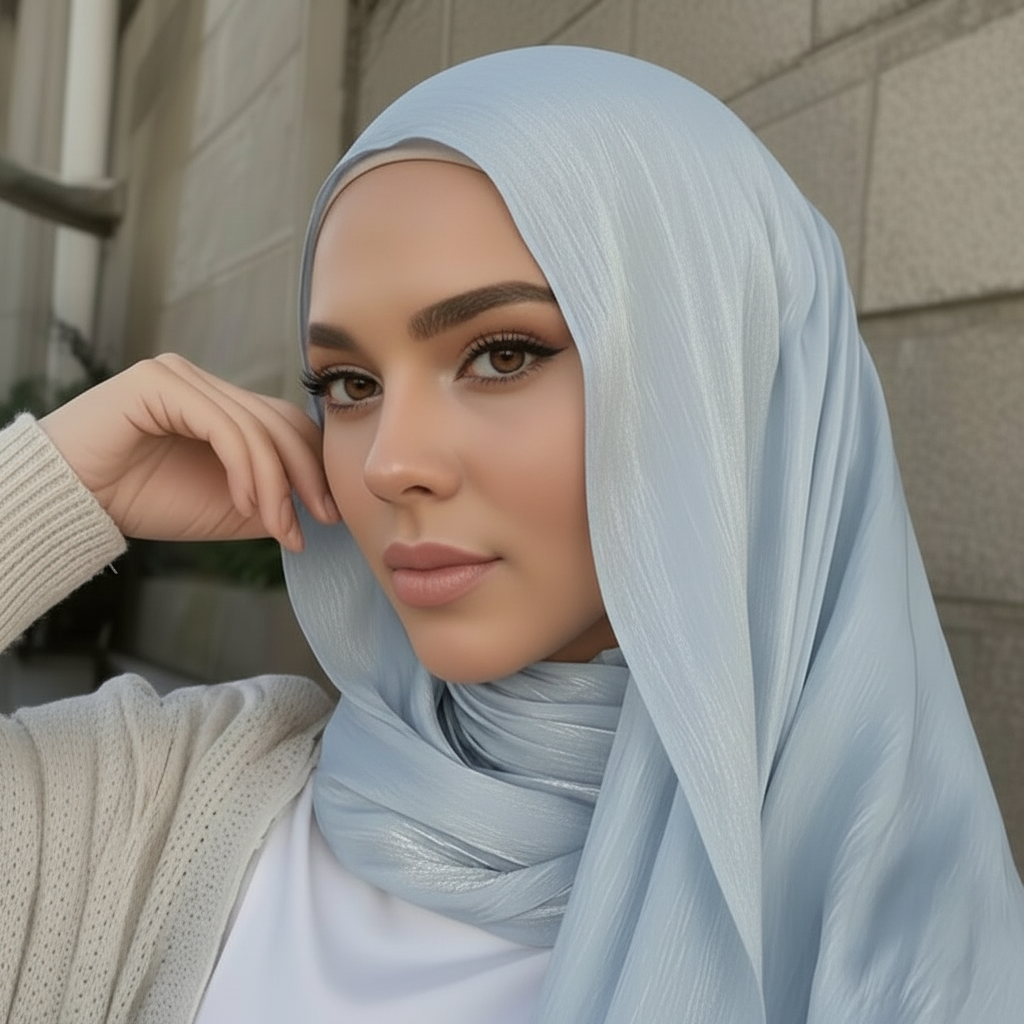 Elevate your style with our Silk Satin Crinkle hijab, a luxurious piece featuring a radiant mirror-like finish that instantly illuminates your face. Combining exceptional softness with a unique non-slip texture, it offers a sophisticated drape that is perfect for both special occasions and everyday elegance.